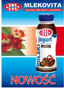 Z myślą o rodzących się wraz z wiosenną pogodą potrzebach naszych Konsumentów przekazujemy w Ich ręce znakomite połączenie kawy z guaraną w postaci jogurtu pitnego. Jest ono idealnym rozwiązaniem dla osób prowadzących aktywny tryb życia oraz uprawiających sport. Zawarta w nim kofeina działa natychmiast, natomiast guarana podtrzymuje dalsze jej działanie. Ponadto guarana podwyższa wytrzymałość, a podczas zmęczenia stosowana jest jako środek stymulujący. Co ważne - odświeża przed wysiłkiem, a w czasie stosowania diety hamuje uczucie głodu. Guarana to roślina dająca dobrą kondycję i lepsze samopoczucie. Działa orzeźwiająco, przede wszystkim dzięki wysokiej koncentracji naturalnej kofeiny.
