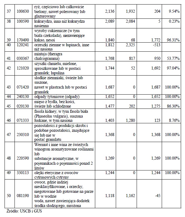 przetwory spożywcze i wieprzowina. We wszystkich tych kategoriach produktów Stany Zjednoczone