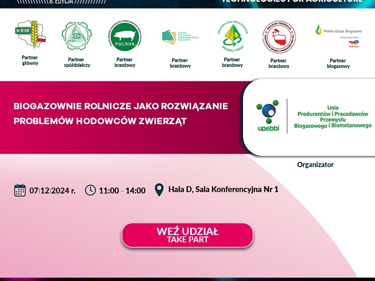 Już 7 grudnia 2024 w drugim dniu Centralnych Targów Rolniczych w Warsaw Ptax Expo (Nadarzyn k/Warszawy), odbędzie konferencja przeznaczona w szczególności dla hodowców zwierząt, rolników, menedżerów, finansistów, administracji i otoczenia biznesu hodowlanego: „Biogazownie rolnicze jako rozwiązanie problemów hodowców zwierząt”.