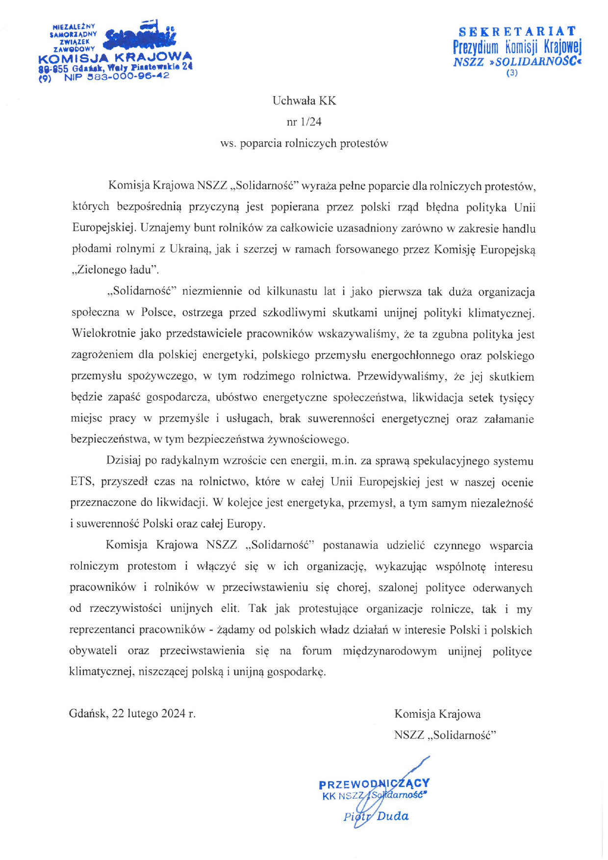 Poniżej pełna treść Uchwały NSZZ Solidarność z dnia 22.lutego.2024 roku.