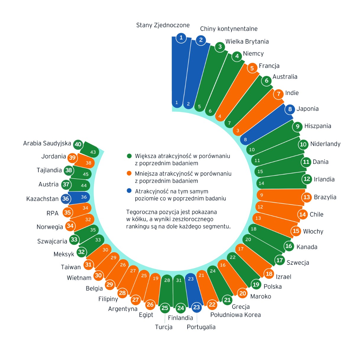 W głównym rankingu wśród krajów europejskich największy awans przypadł Austrii, Finlandii i Danii, przy czym pierwsze dwa kraje są daleko za Polską. Tradycyjnie na czele są Stany Zjednoczone i Chiny. Trzecie miejsce zajęła Wielka Brytania, a Indie, które zajmowały podium w poprzednim rankingu, spadły na 7. miejsce.