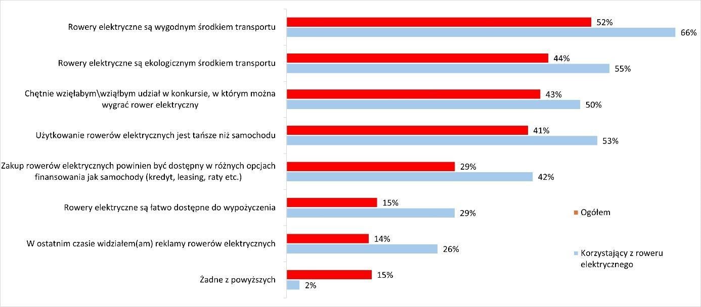 na co dzień mają kontakt z rowerami elektrycznymi. Mniejszy procent respondentów bo 44 proc. wszystkich badanych oraz 55 proc. korzystających z rowerów elektrycznych uważa,